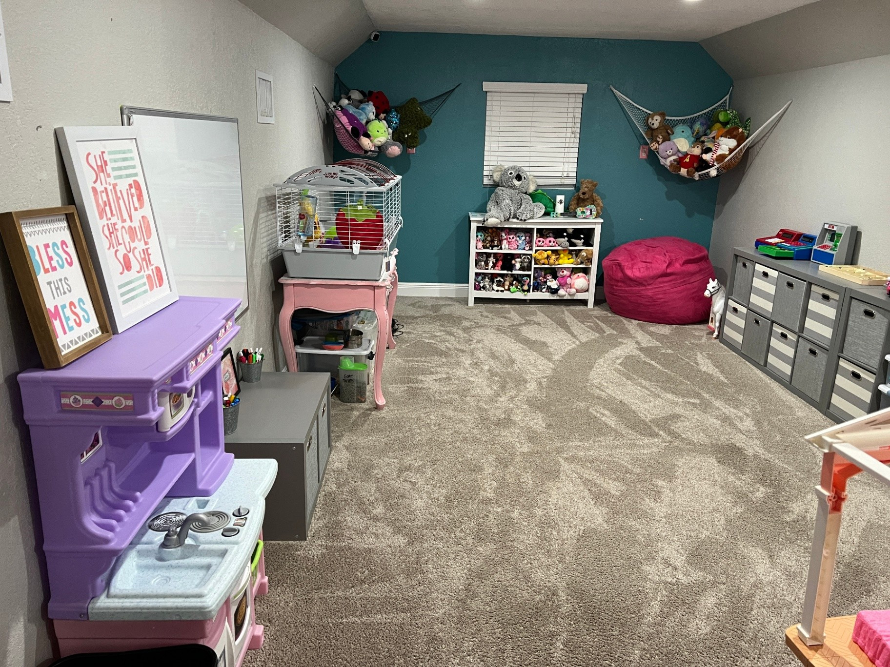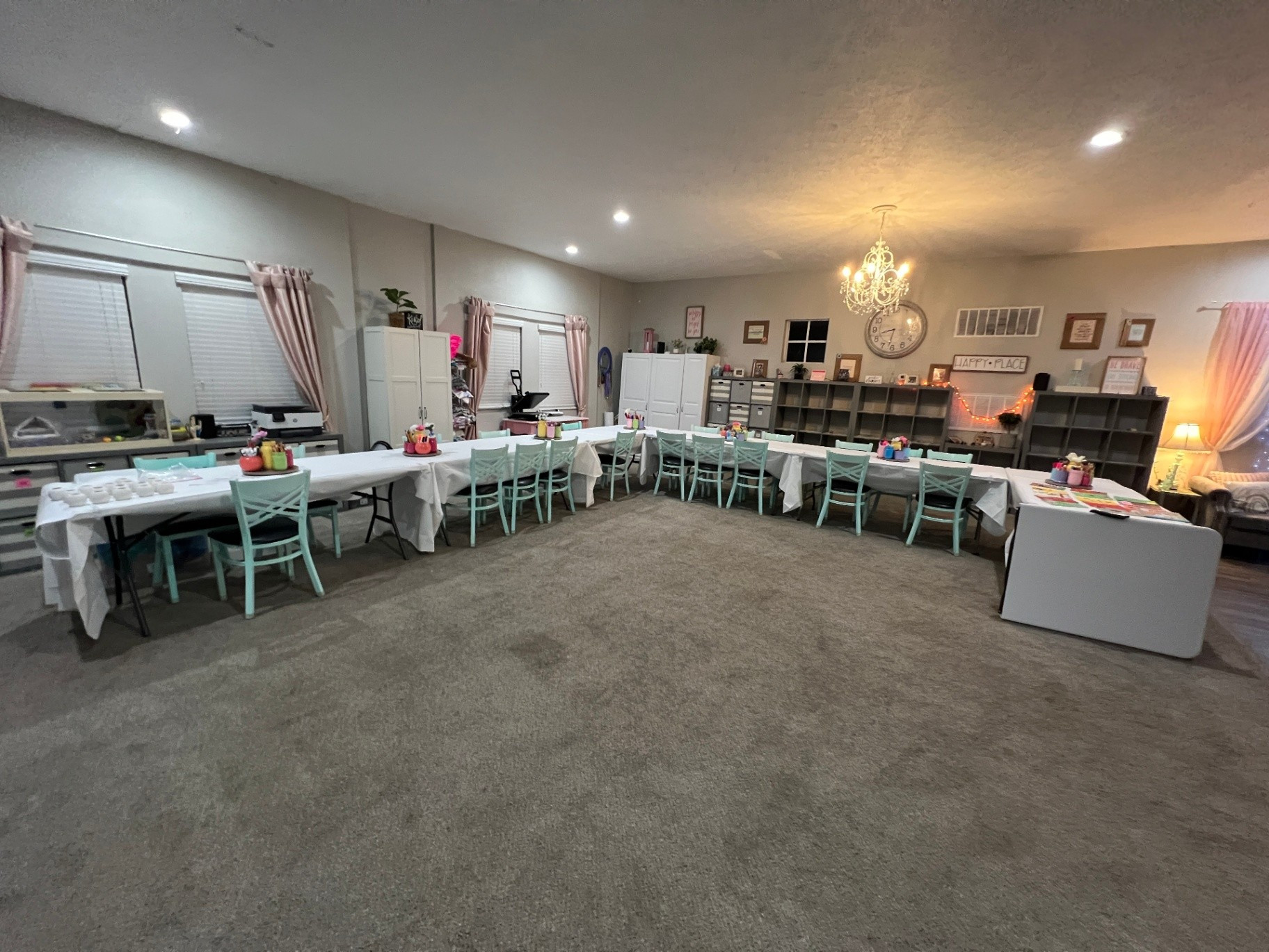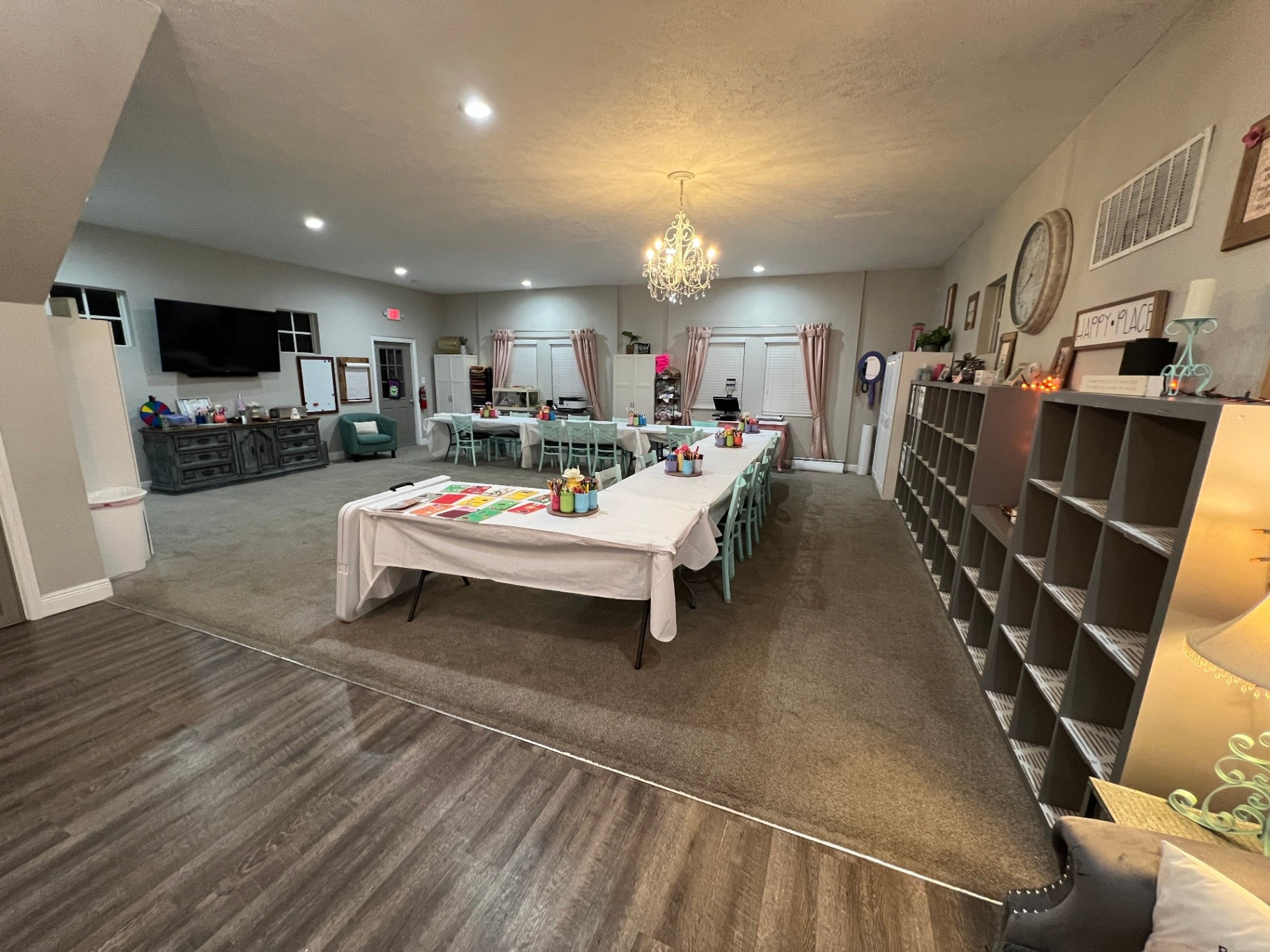 ABOUT OUR CENTER. Our beautiful center has 1400 square footage downstairs and 1300 upstairs. Downstairs we have Audio Visual equipment that includes a 65 inch flat screen TV with HDMI capabilities for showing photo slide shows and/or movies with surround sound speakers throughout. Upstairs is a great place to hang out and have fun at the end of the party. We have a 55 inch flat screen TV with an Xbox, Wii, Karaoke machine and 4-in-1 game table. We also have board games and puzzles, a cute play kitchen, tons of barbies, dolls, legos and toys. So many options of fun for the girls and boys.
