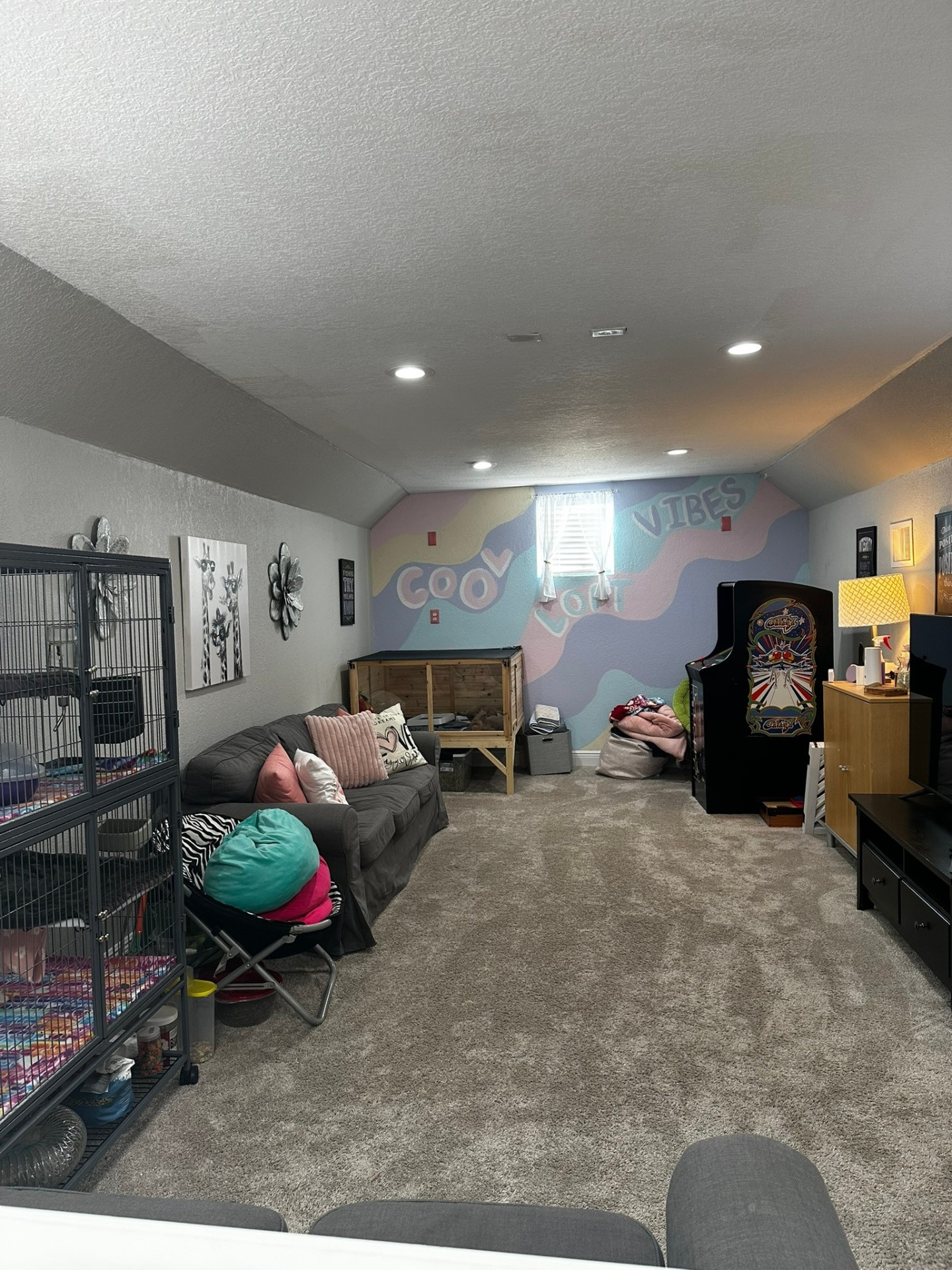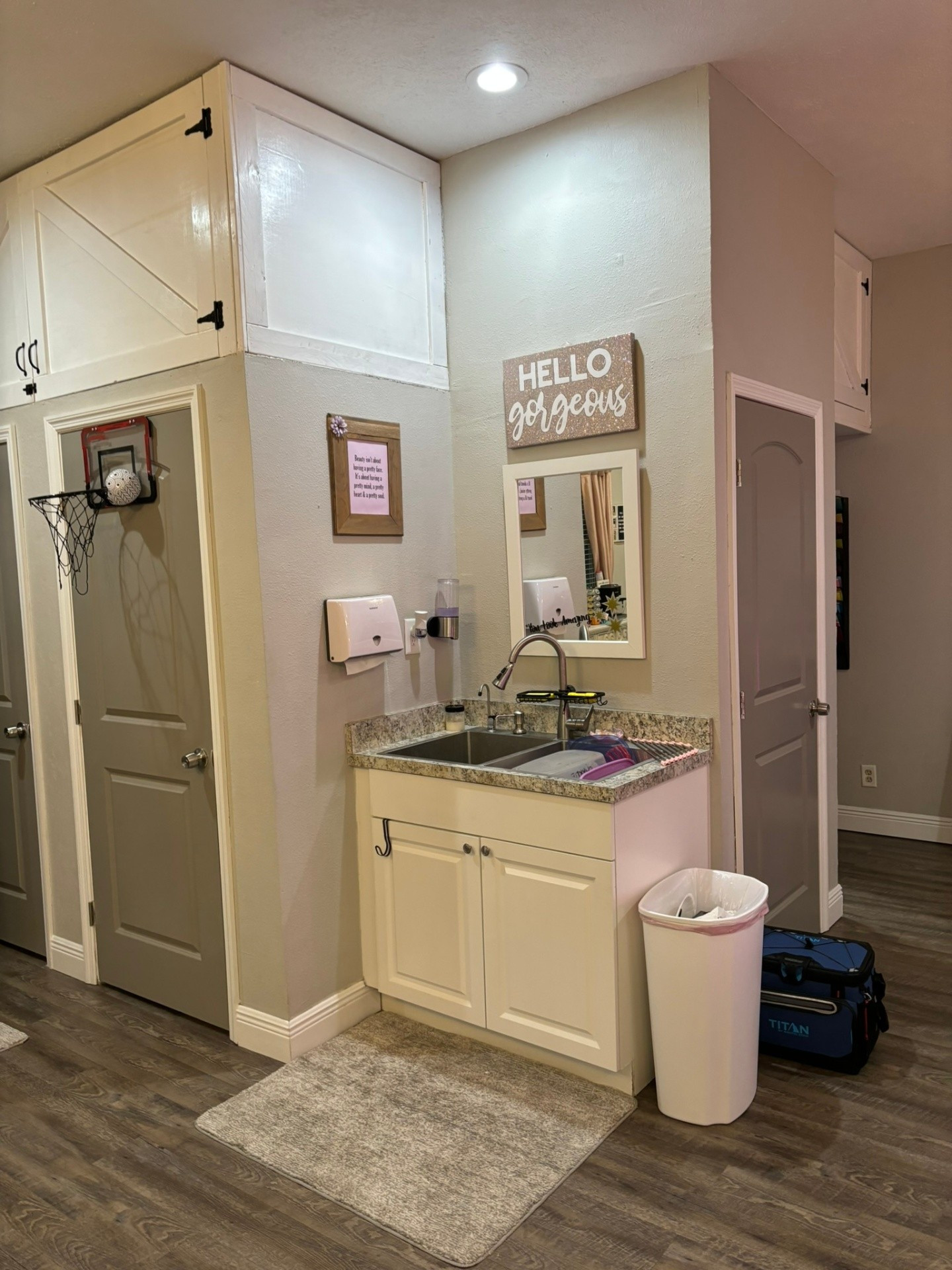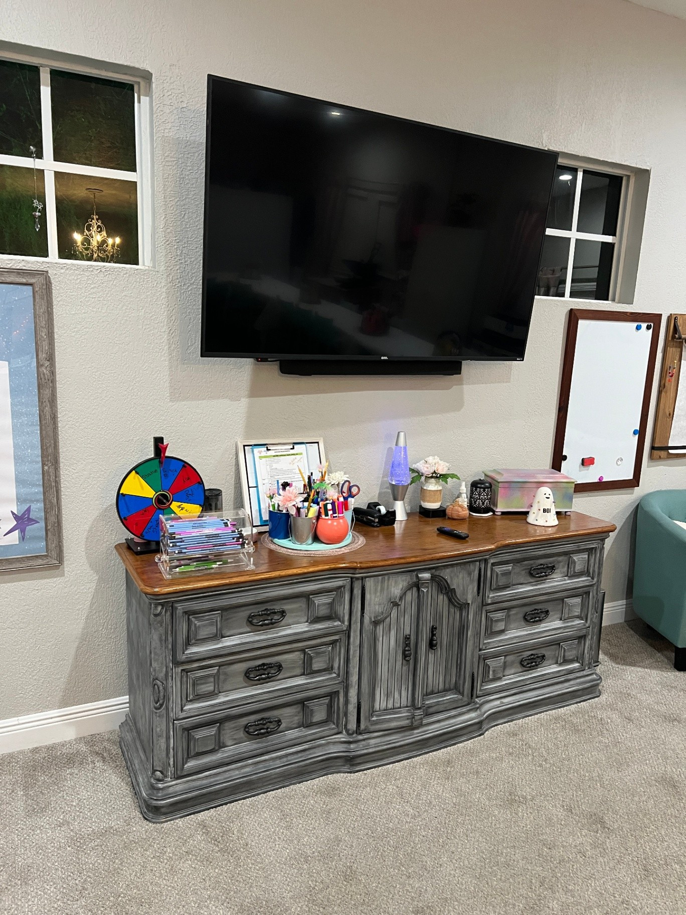 ABOUT OUR CENTER. Our beautiful center has 1400 square footage downstairs and 1300 upstairs. Downstairs we have Audio Visual equipment that includes a 65 inch flat screen TV with HDMI capabilities for showing photo slide shows and/or movies with surround sound speakers throughout. Upstairs is a great place to hang out and have fun at the end of the party. We have a 55 inch flat screen TV with an Xbox, Wii, Karaoke machine and 4-in-1 game table. We also have board games and puzzles, a cute play kitchen, tons of barbies, dolls, legos and toys. So many options of fun for the girls and boys.